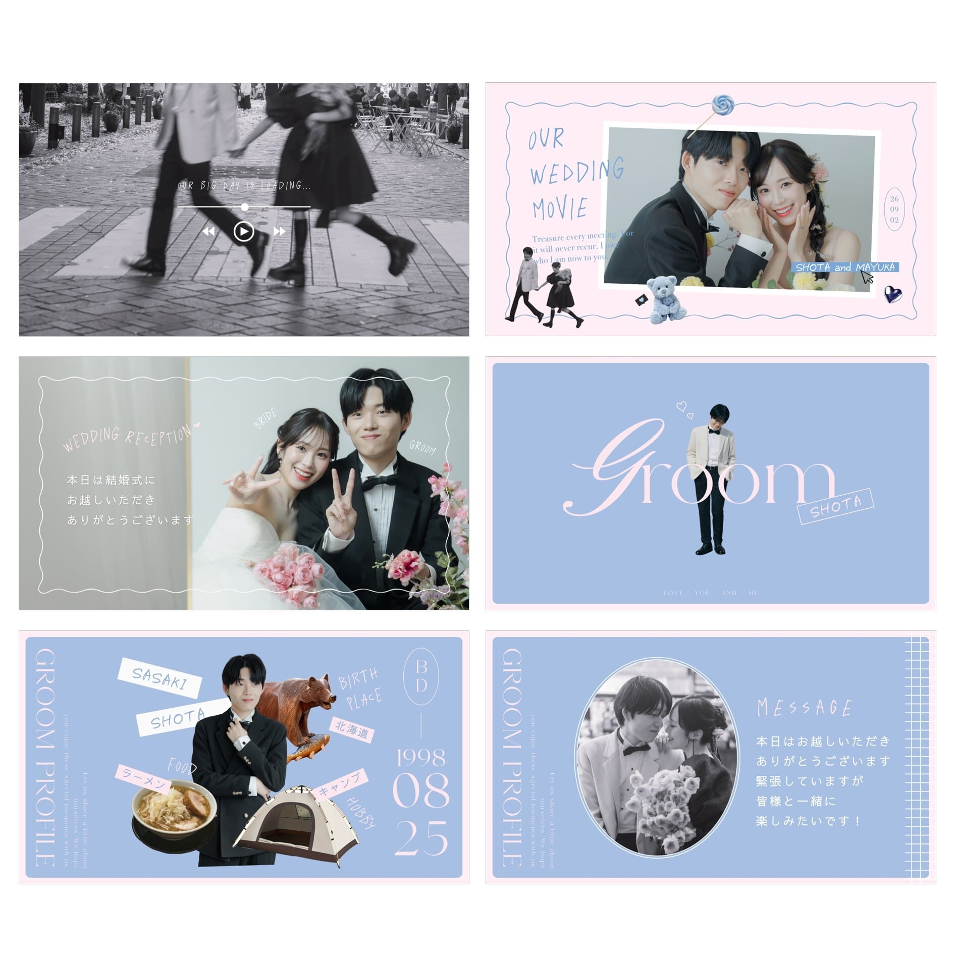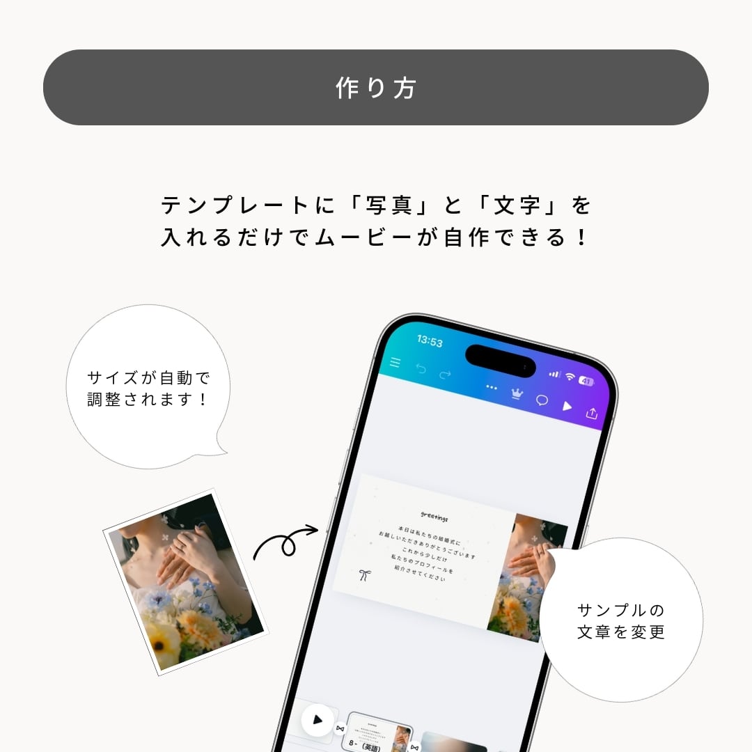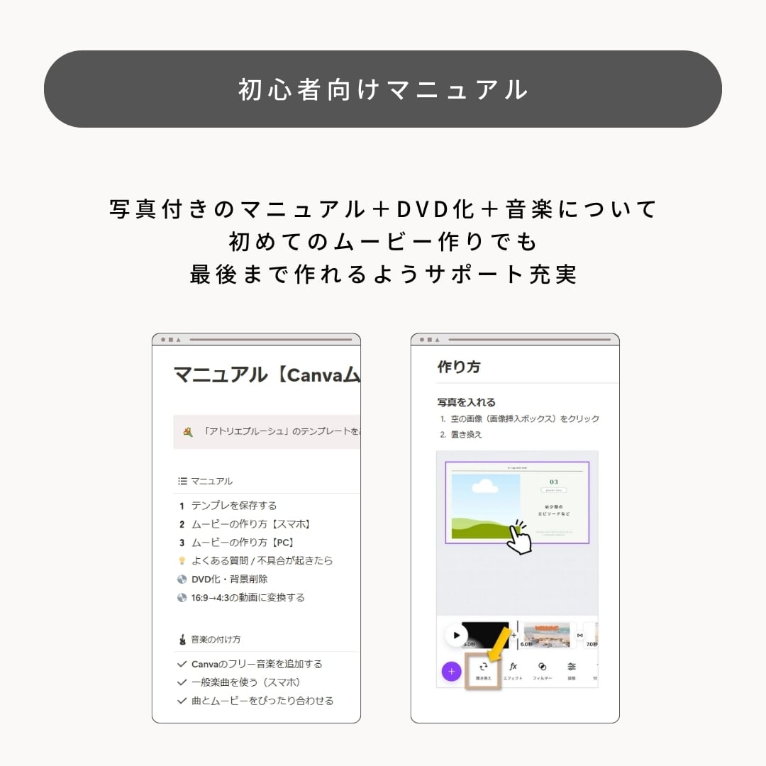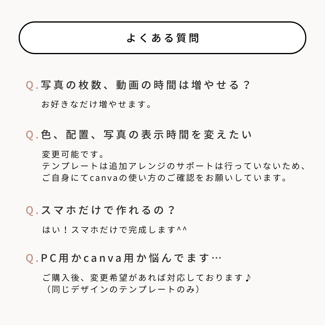 Canvaの仕様上、スマホから多数の動画を挿入するとエラーが発生する場合がございます。PCからの操作、または動画枚数を少なめにしてご利用ください。(他社テンプレートでも同様の事象が起こる可能性がございます。)