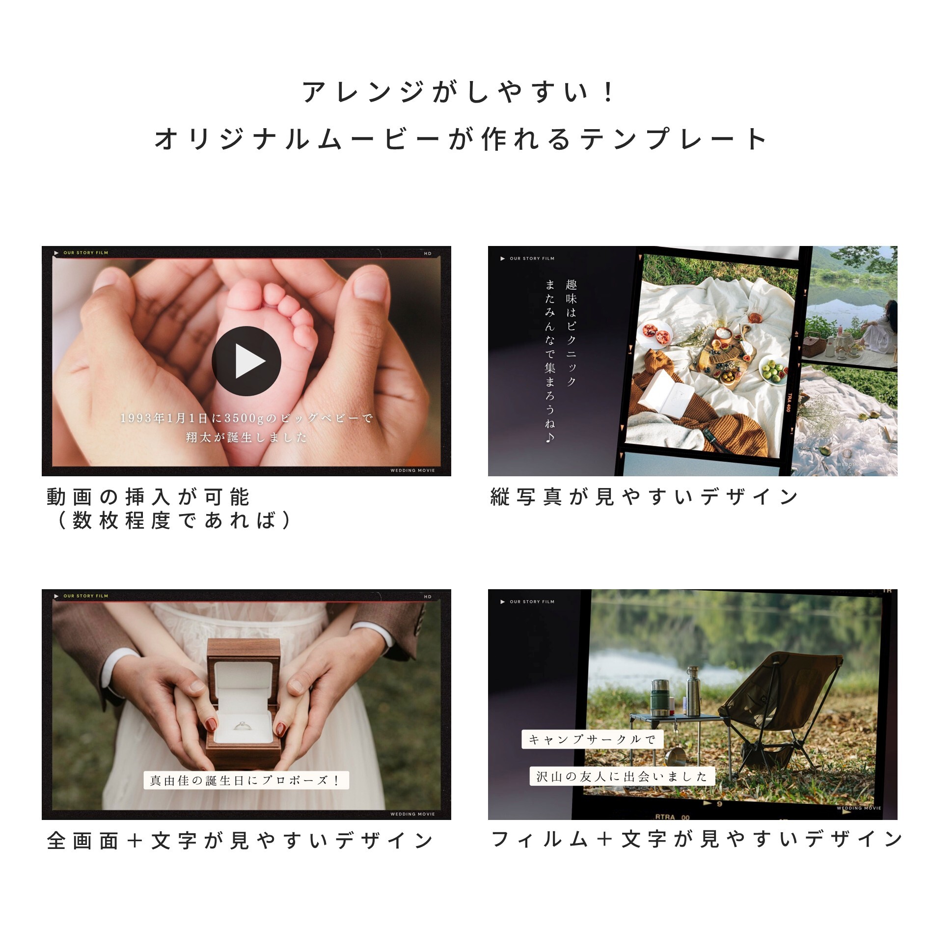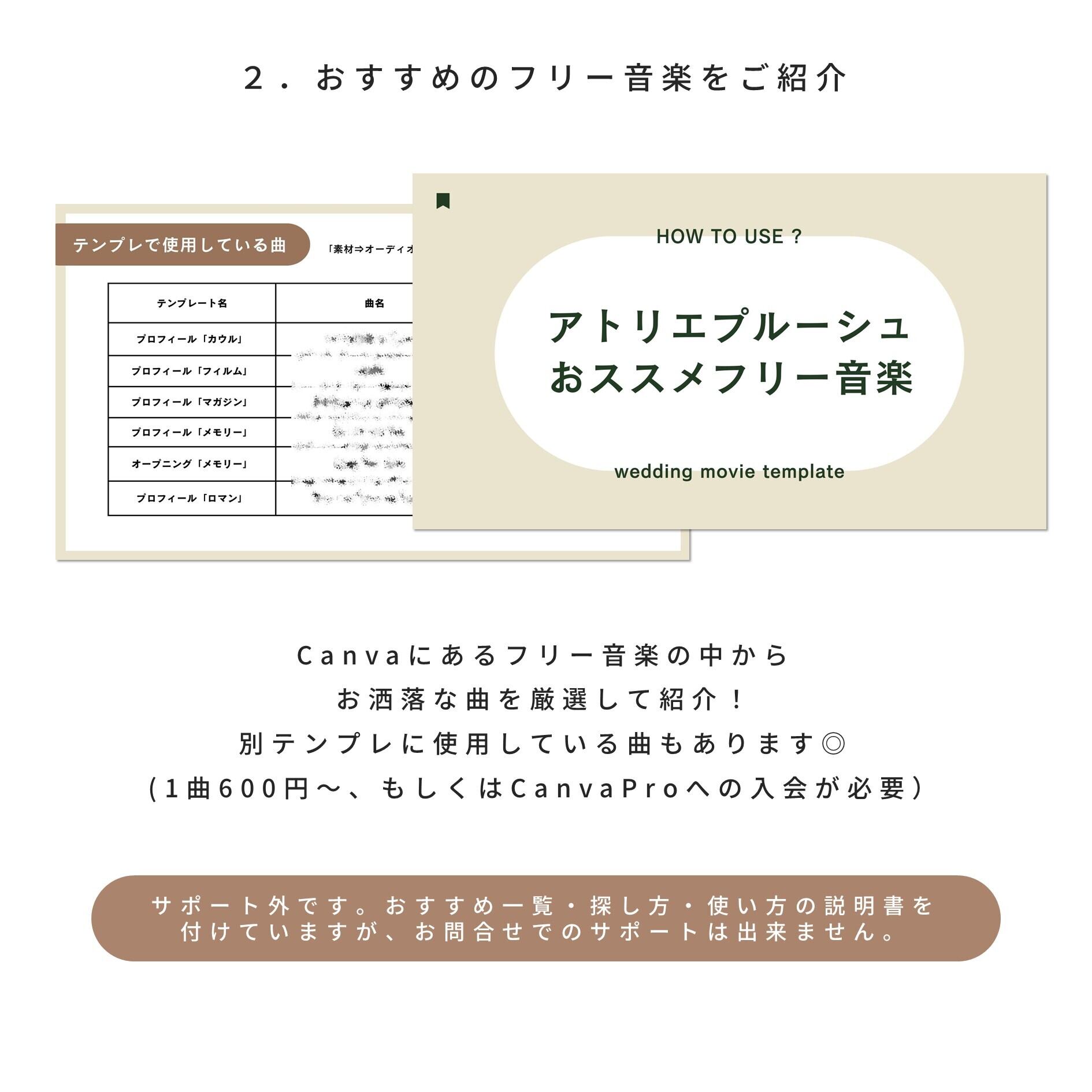 ※動画挿入について、Canvaの仕様上、スマホから多数の動画を挿入するとエラーが起こる場合がございます。PCから操作いただくか、枚数を少なめに抑えていただくことを推奨しております。(Canvaの性能の為、他社テンプレも同様です)